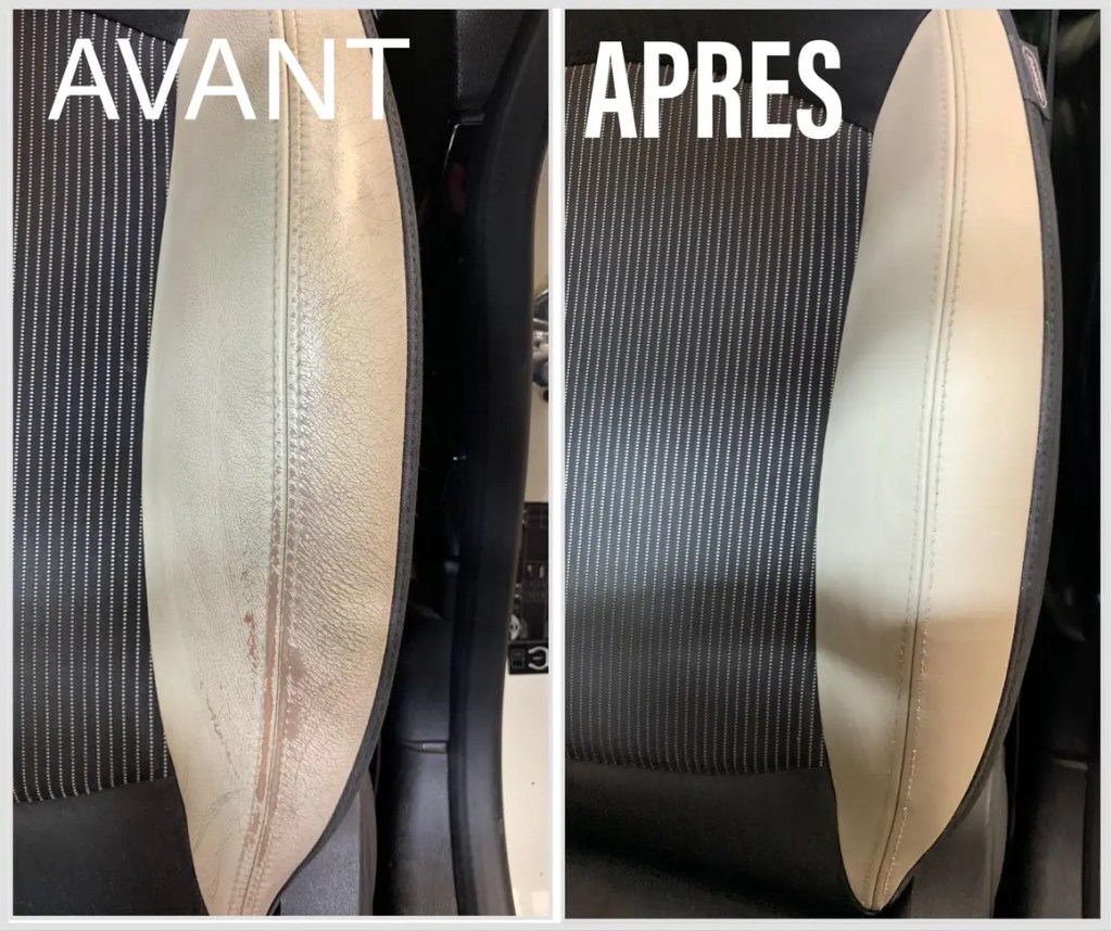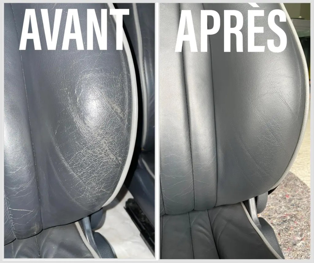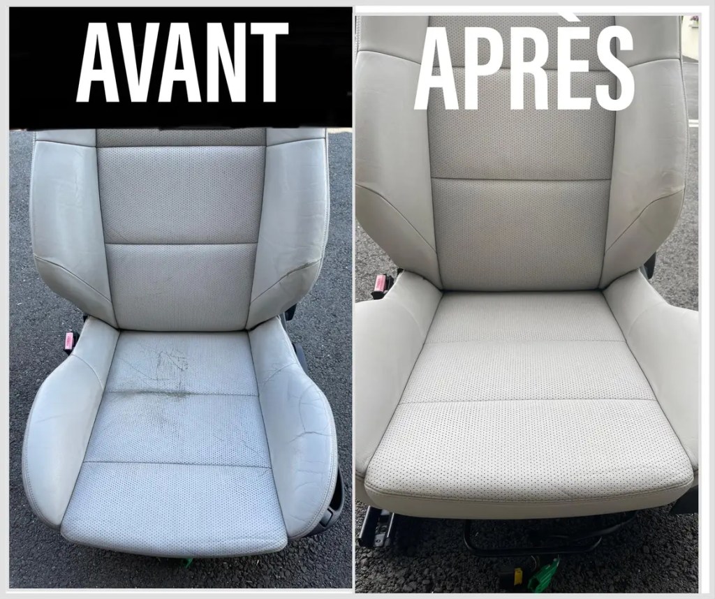Sièges en cuir : À partir de 150 €. Possibilité de recoloration du cuir, comblement des fissures ou petits trous.